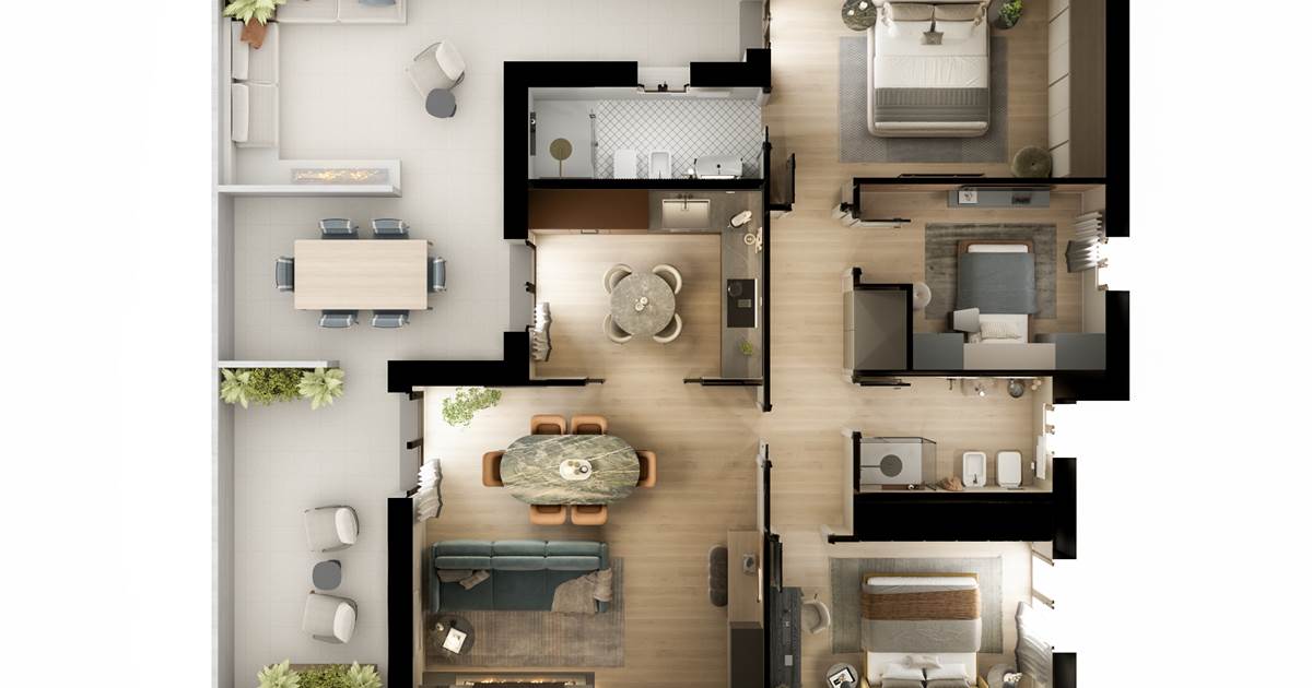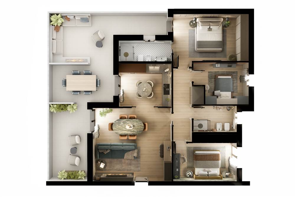 soluzione C1 APPARTAMENTO al primo piano composto da ampia zona soggiorno/pranzo con affaccio su loggia coperta, cucina, tre camere da letto, due bagni (di cui uno en-suite), garage e posto auto coperto.