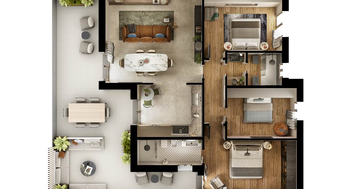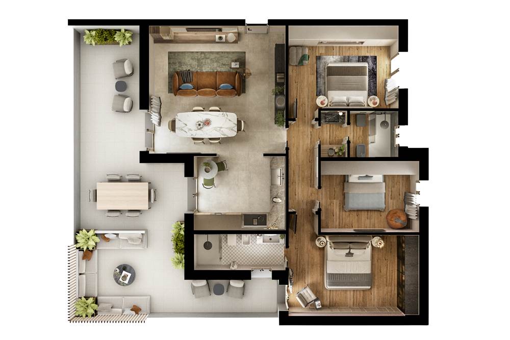 soluzione C2 APPARTAMENTO al primo piano composto da ampia zona soggiorno/pranzo con affaccio su loggia coperta, cucina, tre camere da letto, due bagni (di cui uno en-suite), garage e posto auto coperto.