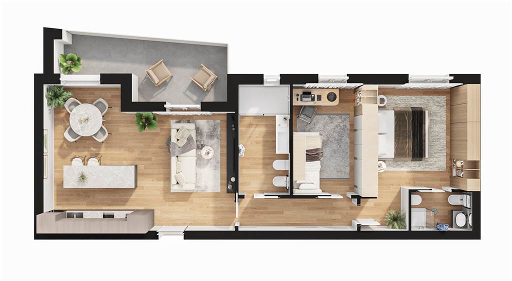 SOLUZIONE A2: appartamento al primo piano composto da sala con cucina a vista e affaccio su balcone loggiato, camera matrimoniale, camera singola, 2 bagni, autorimessa e posto auto coperto.