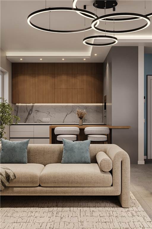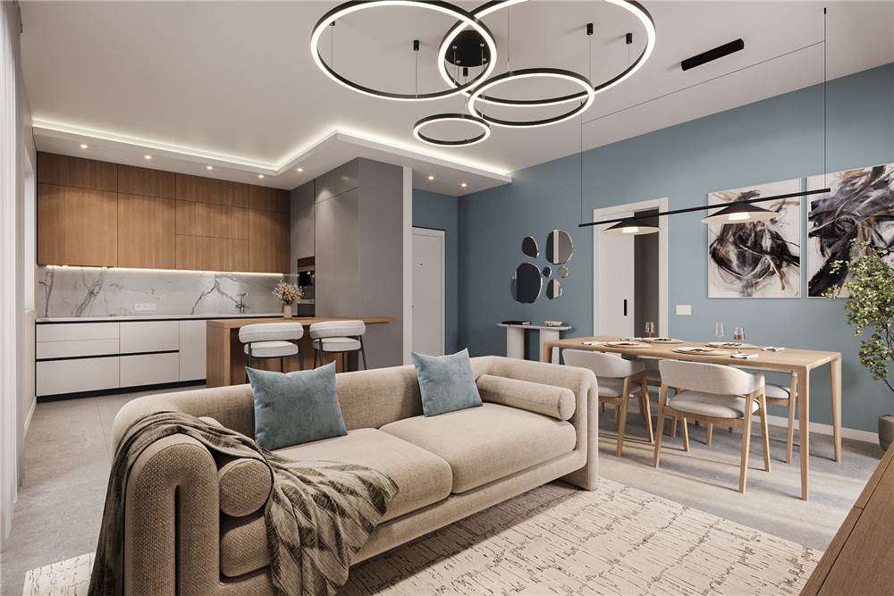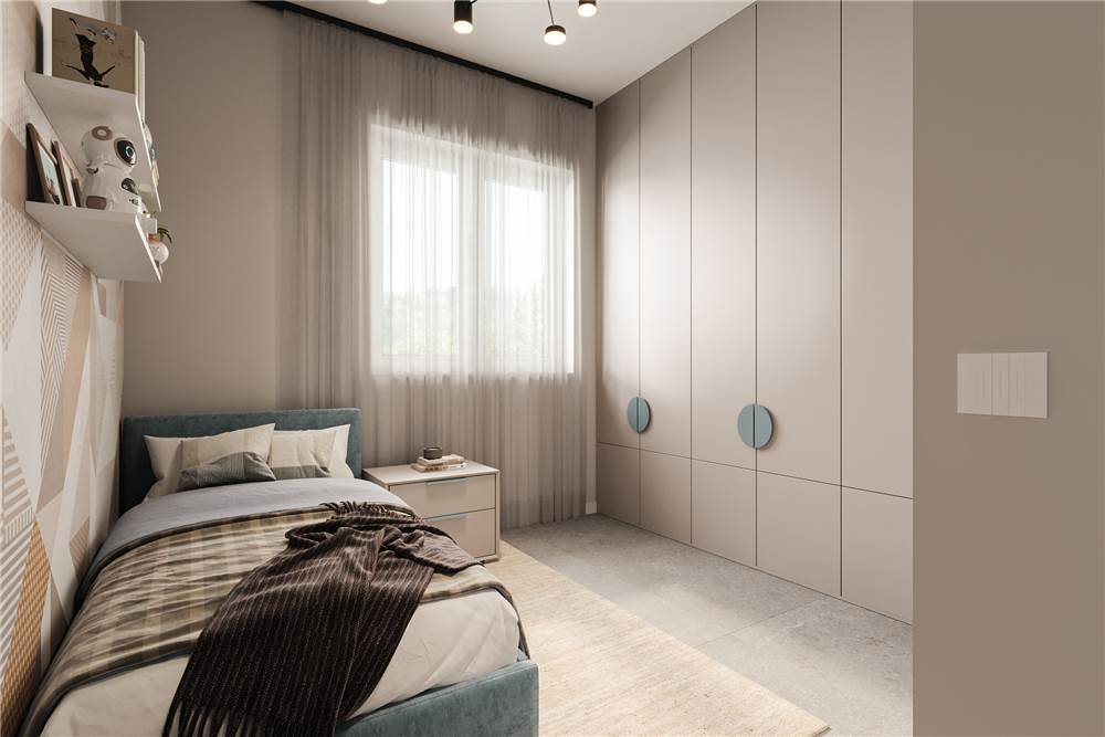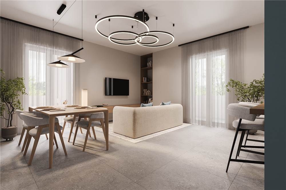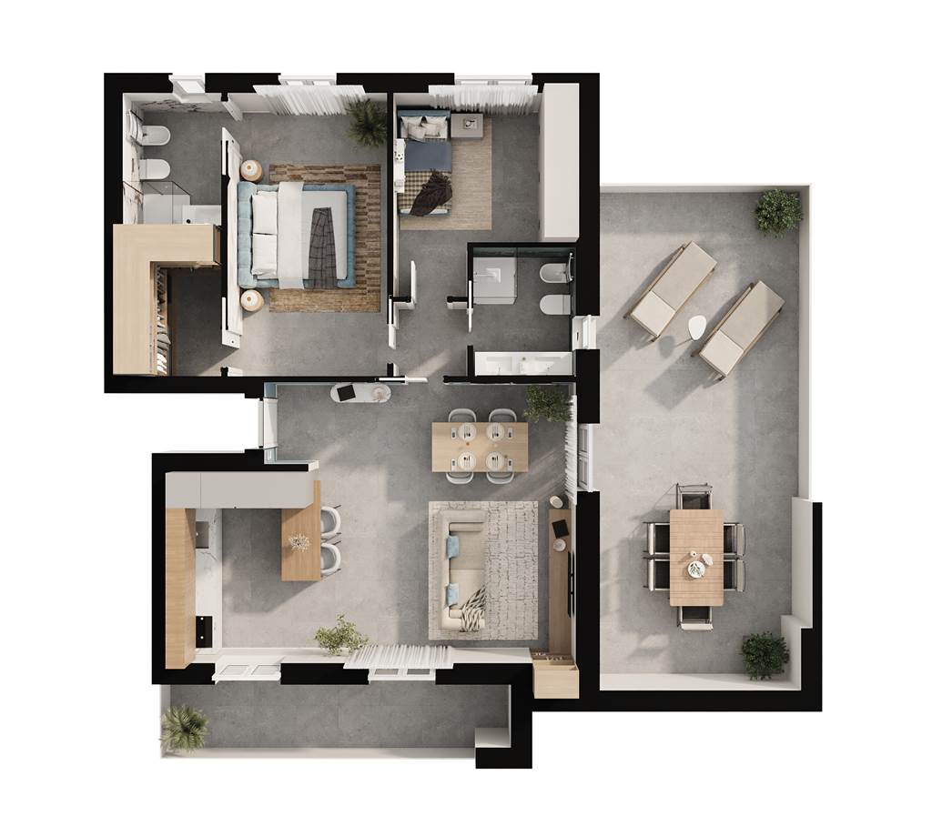 SOLUZIONE B4: appartamento al secondo piano composto da sala con cucina a vista e affaccio su balcone e ampia terrazza, camera matrimoniale, camera singola, 2 bagni, autorimessa e posto auto coperto.