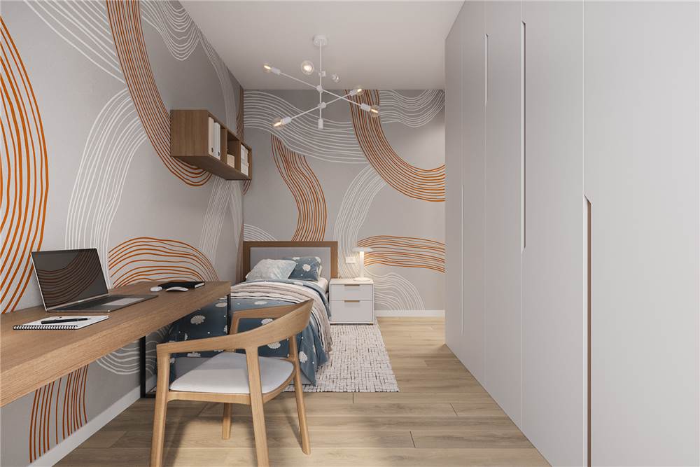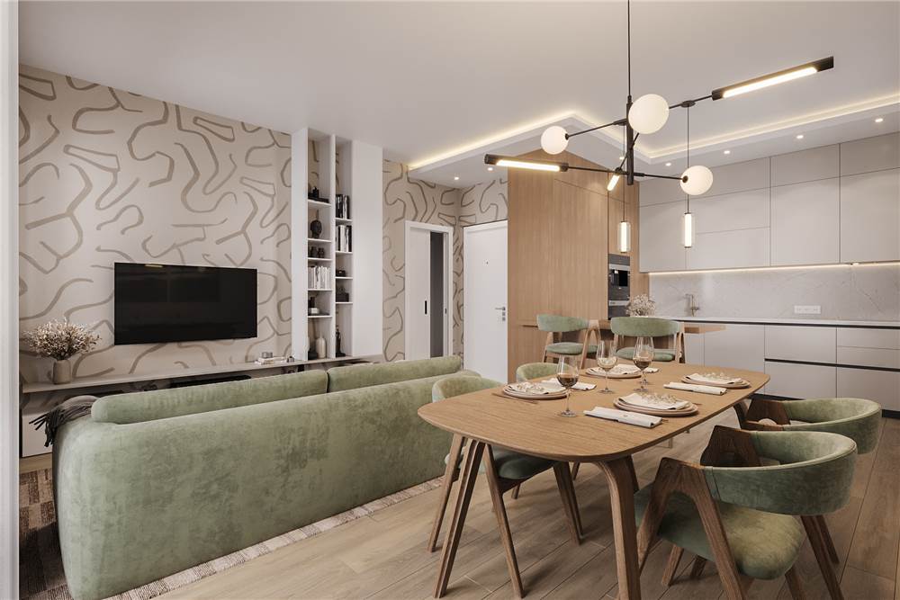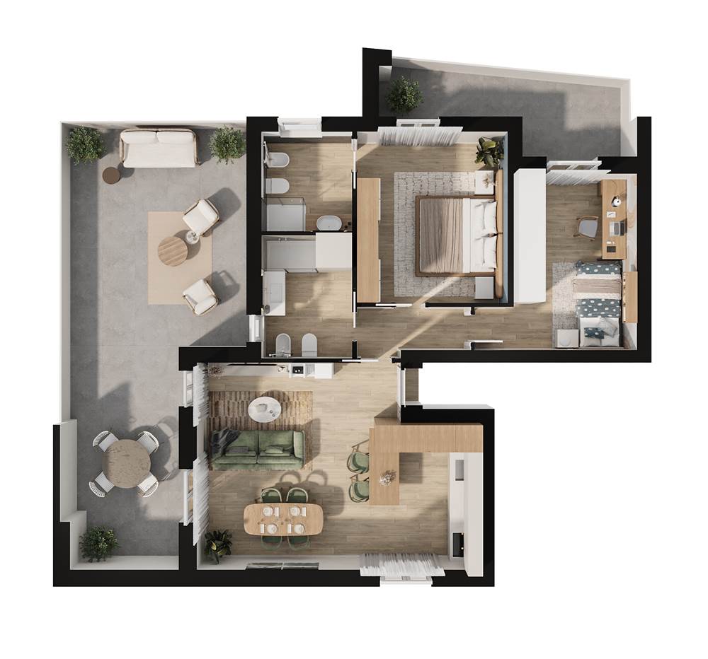 SOLUZIONE B5: appartamento al secondo piano composto da sala con cucina a vista e affaccio su balcone e ampia terrazza, camera matrimoniale, camera singola, 2 bagni, autorimessa e posto auto coperto.