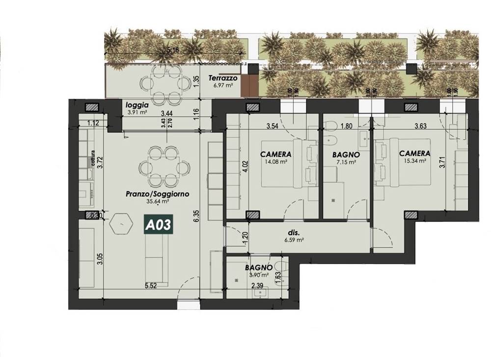 App.to così disposto: ingresso, soggiorno con sbocco sul terrazzo e giardino pensile, cucina a vista, dis. notte, due camere da letto e due bagni (uno cieco).