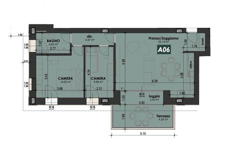 App.to così disposto: ingresso, soggiorno con sbocco sul terrazzo, cucina a vista, dis. notte, due camere da letto e un bagno.