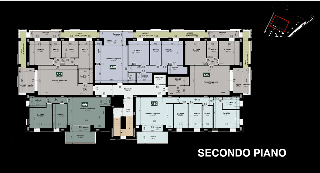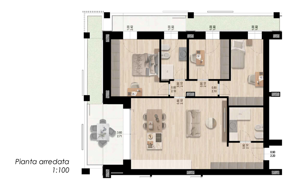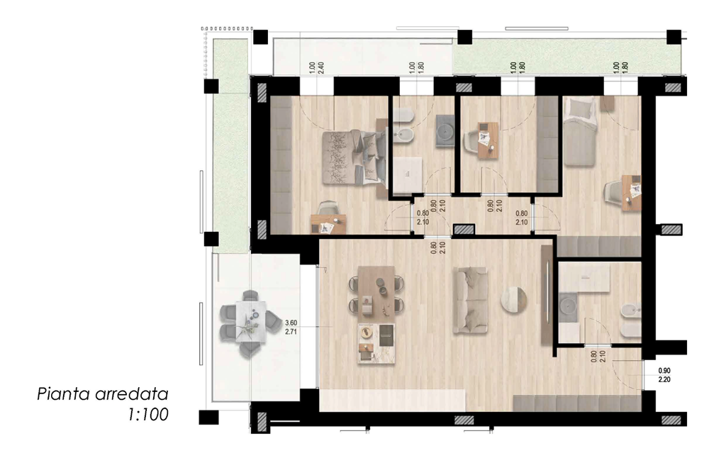 App.to così disposto: ingresso, soggiorno con sbocco sul terrazzo e giardino pensile, cucina a vista, bagno cieco, dis. notte, due camere da letto, uno studio, bagno finestrato e secondo terrazzo con giardino pensile.