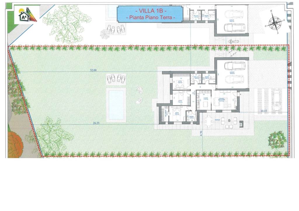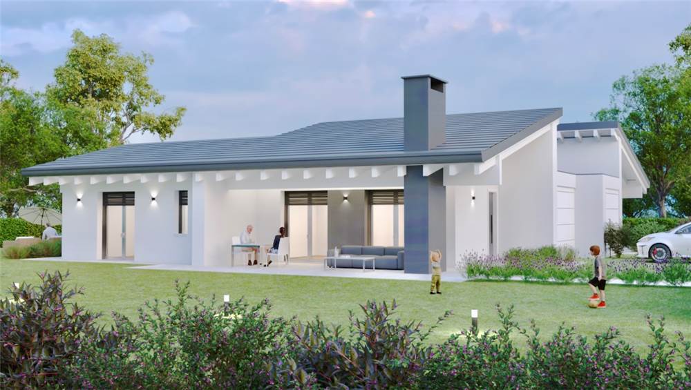 Piano Terra: ingresso su soggiorno, cucina abitabile, due bagni, disimpegno, tre camere (due camere matrimoniali e una camera singola) di cui una con cabina armadi, ripostiglio/lavanderia. Garage doppio. Classe A4. Consegna 2027.