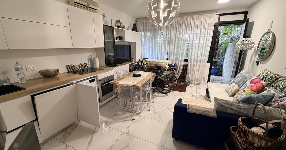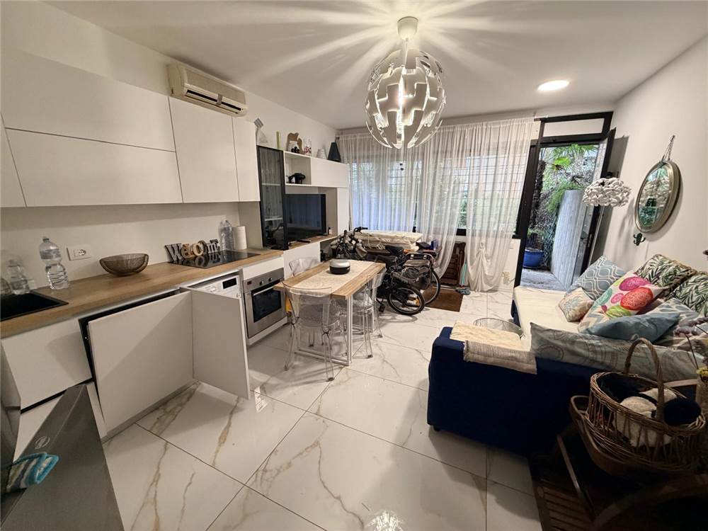 Affittiamo un appartamento con ingresso indipendente e giardino privato con portico esterno, composto da: soggiorno, pranzo con angolo cottura e bagno al piano principale; al piano sottostante (collegato da scala a chiocciola) si trovano una camera da letto, un piccolo vano con divano letto e un secondo bagno.